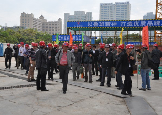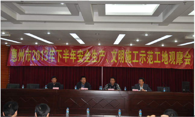 2013年11月27日上午,“廣東省房屋市政工程安全生產(chǎn)文明施工示范工地”示評(píng)會(huì)在惠州公司大隆·財(cái)富廣場(chǎng)項(xiàng)目工地現(xiàn)場(chǎng)召開。廣東省住房和城鄉(xiāng)建設(shè)廳質(zhì)量安全監(jiān)管處調(diào)研員彭雞寶、廣東省建筑安全協(xié)會(huì)會(huì)長(zhǎng)鐘偉文、惠州市住房和城鄉(xiāng)規(guī)劃建設(shè)局副局長(zhǎng)陳訓(xùn)政、惠城區(qū)城鄉(xiāng)規(guī)劃建設(shè)局副局長(zhǎng)月明應(yīng)邀出席了本次會(huì)議,一同參加會(huì)議的還有擔(dān)任本次評(píng)審工作的30位評(píng)審專家。會(huì)議由廣東省建筑安全協(xié)會(huì)副秘書長(zhǎng)王啟主持。