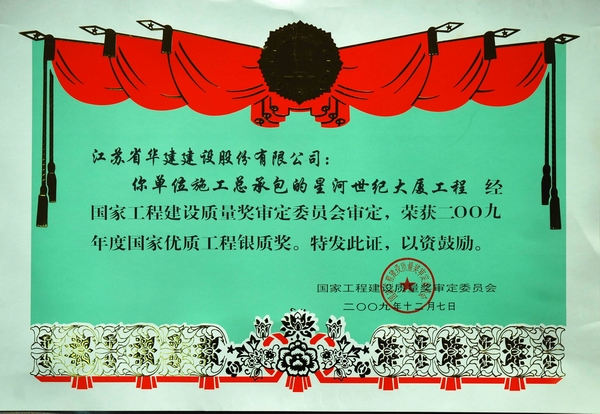 星河世紀大廈 時間:2010-01-19 8355 該工程位于深圳市福田區深南大道南與彩田路西交匯處,是深圳市中心區東門標志性建筑。該工程一裙三塔,32-39層,高173.2米,總建筑面積156680平方米,是集辦公、商業、住宅為一體的綜合樓。 該工程先后榮獲2006年度“深圳市安全生產文明施工優良工地”、2007年度深圳市優質工程“金牛獎”第一名、2007年度廣東省優良樣板工程獎、2007年度江蘇省“揚子杯”省外優質工程獎,2009年12月被評為2009年度國家優質工程銀質獎。