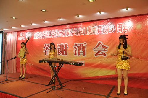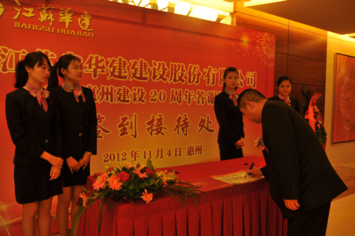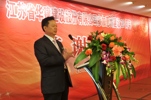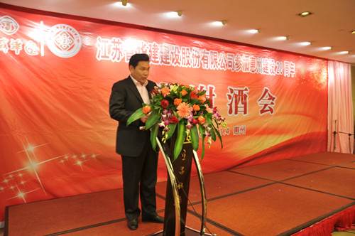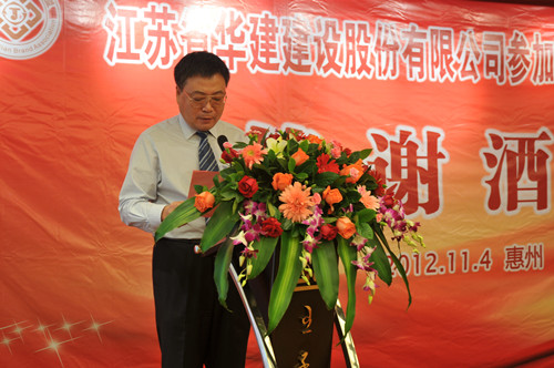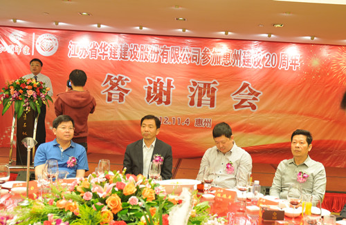11月4日,公司在惠州隆重舉辦參加惠州建設20周年答謝酒會,副董事長、總經理宗有農主持并作開場致辭。惠州市有關政府部門、部分合作方企業的負責人,華建聯盟成員單位負責人,公司董事、監事和高管等130余人出席酒會?;葜莨究偨浝砣A恒榮介紹了公司參加惠州建設二十年的有關情況?;葜菔泄ど搪撝飨⒑阌顚崢I發展公司董事長楊滿芳代表合作方發言,惠州市住房和城鄉規劃建設局副局長陳訓政代表政府主管部門致辭,分別對江蘇華建進惠施工二十周年表示祝賀。公司董事長陸金龍代表總部對惠州市有關政府部門、相關合作方和社會各界人士給予公司的關心和支持表示誠摯的感謝,并表達了進一步加大支持力度、加強戰略合作、加快科學發展的意愿。