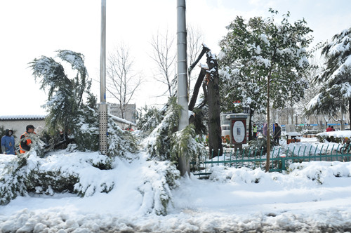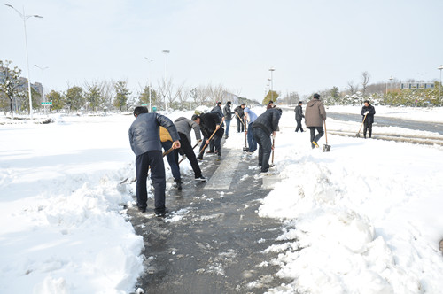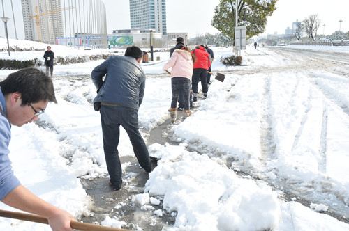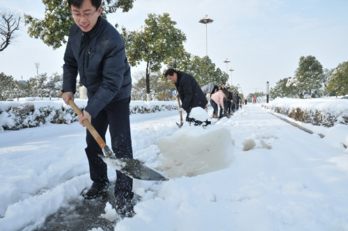 公司總部組織員工上路清掃積雪 時間:2013-02-19 4032 2月18日至19日凌晨,揚州出現低溫降雪災害天氣,降下了多年罕見的一場大雪,壓垮樹枝和部分房屋設施,并造成道路交通不便。19日清晨,公司響應市政府號召,組織20余名員工上路清掃積雪,公司領導吳士茂、錢啟明親自參加,與大家共同會戰2個多小時,完成了清掃任務。 厚重的積雪壓垮樹枝