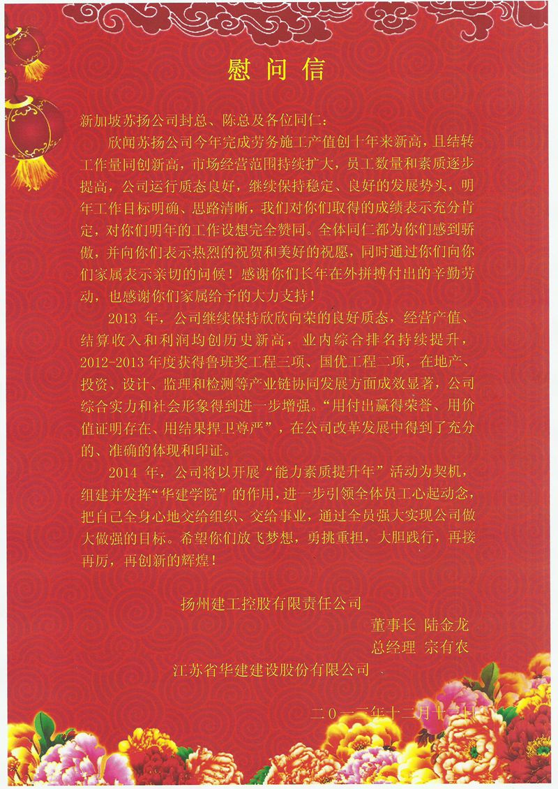 公司董事長、總經(jīng)理發(fā)慰問信鼓勵新加坡蘇揚公司再接再厲