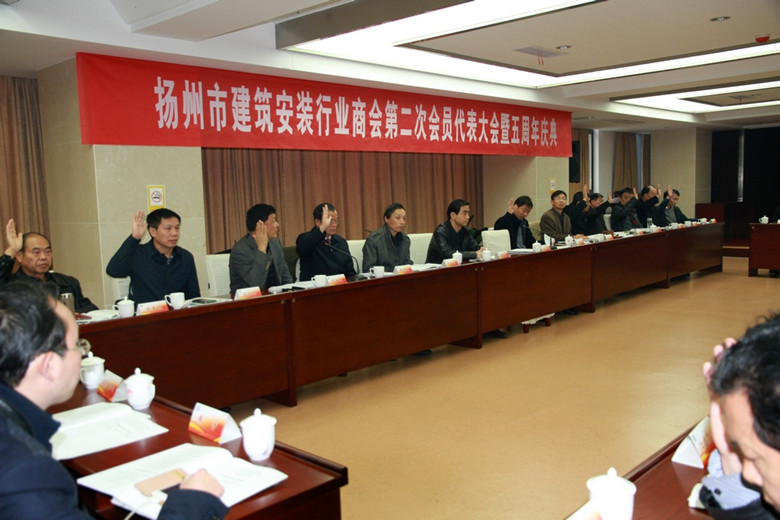 11月28日,揚州市建筑安裝行業商會在高郵市隆重召開第二次會員代表大會暨成立五周年慶典活動,46家會員企業代表參加,揚州市人大副主任、市工商聯主席、總商會會長孫永如,市委統戰部副部長、揚州市工商聯黨組書記、總商會黨委書記趙振東,市工商聯、總商會秘書長劉俊,市民政局社團管理處處長張紹華等出席會議,市房地產商會、建筑業協會等兄弟友好商會會長列席會議。