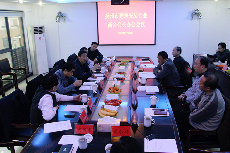 12月24日下午,揚州市建筑安裝行業商會在江蘇滬武建設集團會議室召開2015年度會長辦公會,陸金龍會長主持會議,各位副會長、秘書長參加會議,揚州市委統戰部副部長、市工商聯副主席兼黨組書記、市總商會副會長趙振東和市工商聯(總商會)會員處處長田德兵應邀出席。