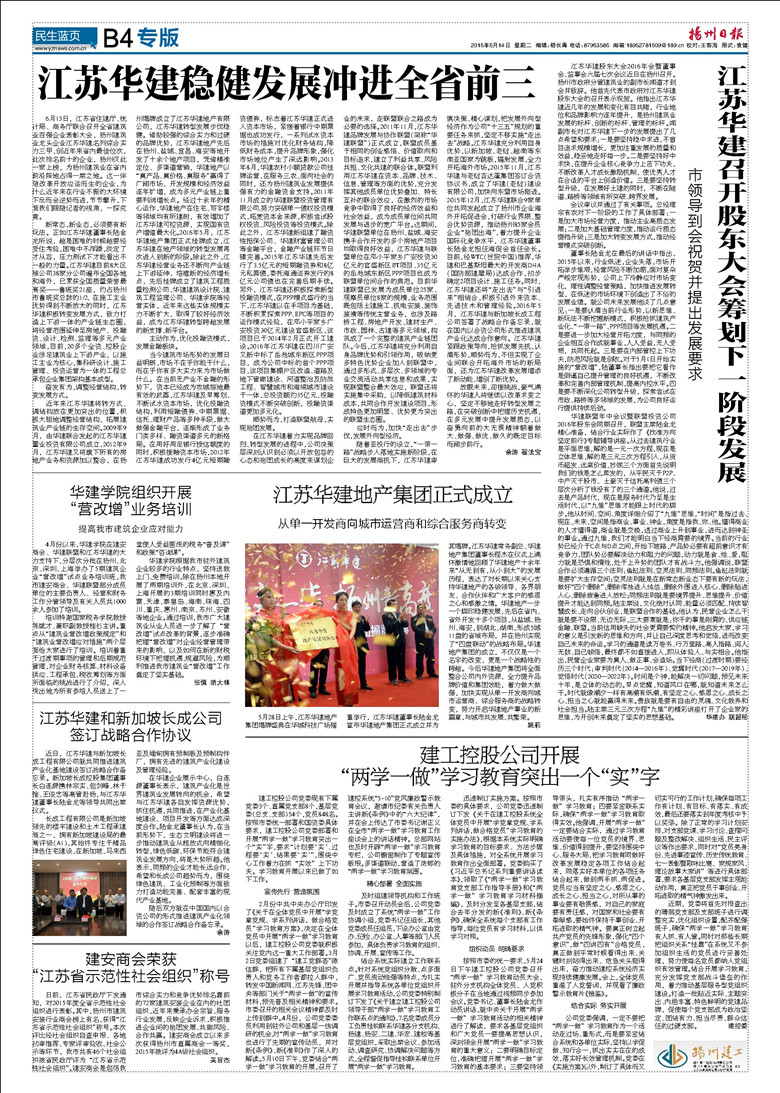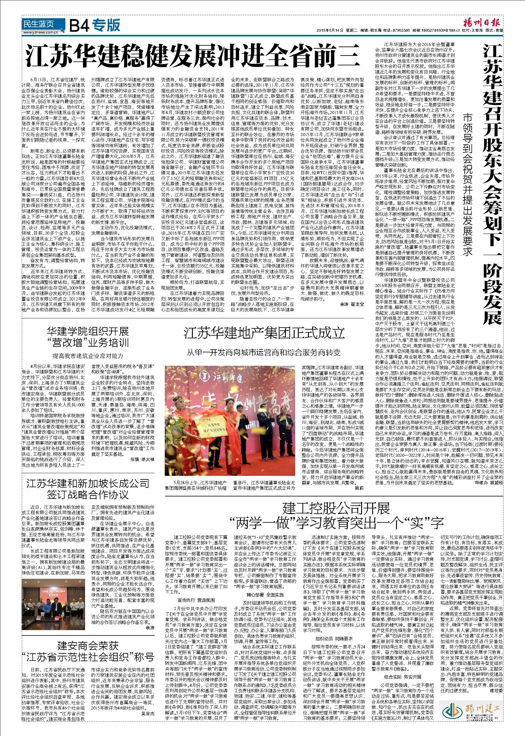 今日《揚州日報》刊登專版文章報道華建進入全省前三有關(guān)消息 時間:2016-06-14 4127 今天出版的《揚州日報》B4“揚州建工”專版刊登了江蘇華建穩(wěn)健發(fā)展沖進全省前三、華建股東大會、華建地產(chǎn)集團成立、“兩學(xué)一做”學(xué)習(xí)教育等相關(guān)文章,歡迎關(guān)注。