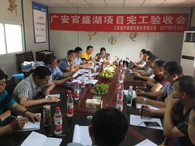 華建第一壩——官盛湖大壩工程順利通過完工驗收 時間:2017-07-03 3776 6月30日上午,華建首個水利項目——官盛湖大壩工程完工驗收會在項目會議室召開,廣安官盛新區管委會副主任蔣成文主持會議。經項目勘察、設計、監理、區住建局、質監站、水務局、發改局、財政局等單位和業主現場代表實測檢查、分別總結匯報后,一致同意工程驗收合格。 官盛湖大壩作為一項以城市景觀為主、兼有防洪功能的綜合性水利工程,主要由樞紐工程、泄洪渠工程組成。官盛湖湖區總庫容987.73萬立方米,壩頂長349米,最大壩高48.5米,壩體填筑總量達157.93萬方。