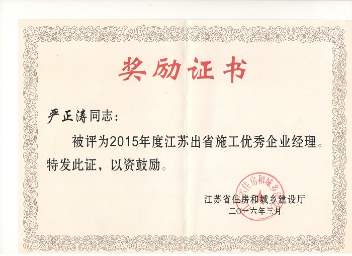 重慶分公司被表彰為“2015年度江蘇出省施工先進(jìn)企業(yè)” 時(shí)間:2016-04-20 2988 近日,重慶分公司被江蘇省住房和城鄉(xiāng)建設(shè)廳表彰為“2015年度江蘇出省施工先進(jìn)企業(yè)”,重慶分公司總經(jīng)理嚴(yán)正濤榮獲“2015年度江蘇出省施工優(yōu)秀企業(yè)經(jīng)理”稱號(hào),樊晨亮被評(píng)為“2015年度出省施工優(yōu)秀黨務(wù)工作者”。