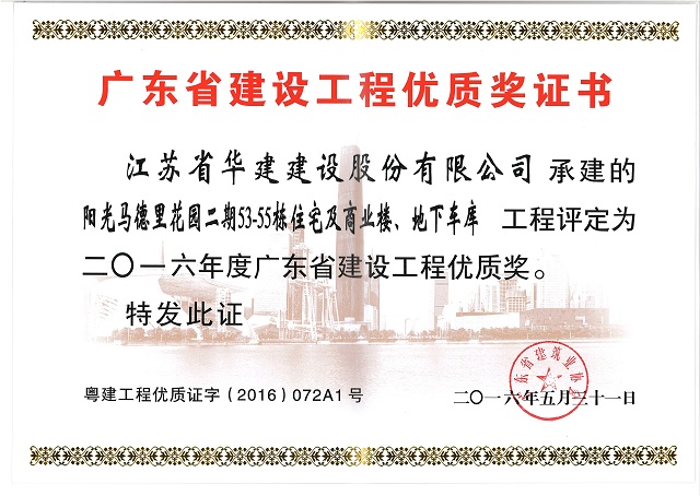 2016年度陽(yáng)光馬德里53-55棟建設(shè)工程廣東省優(yōu)質(zhì)獎(jiǎng)
