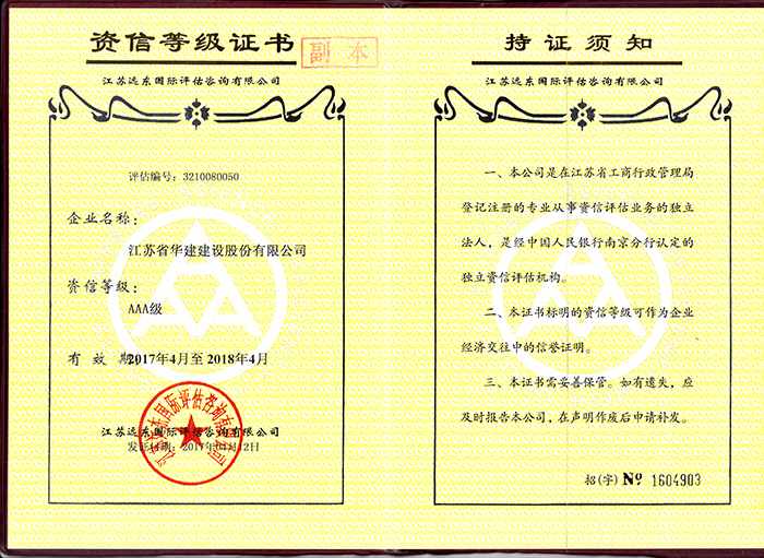 經(jīng)江蘇遠(yuǎn)東國(guó)際評(píng)估咨詢(xún)有限公司專(zhuān)家委員會(huì)審定,江蘇省華建建設(shè)股份有限公司資信等級(jí)為AAA級(jí)...