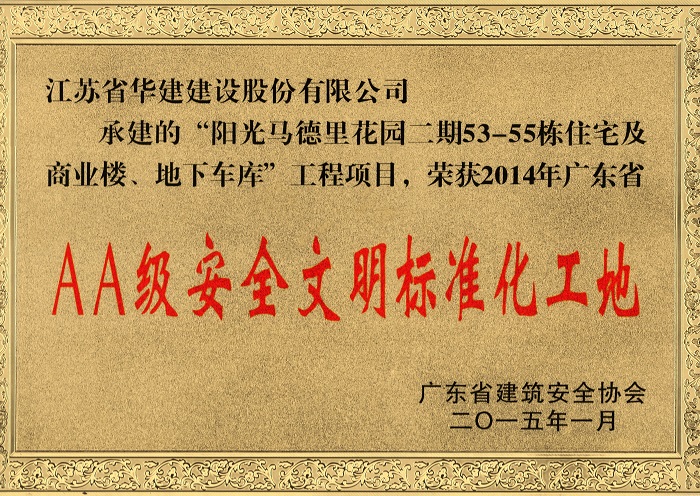 AAA級安全文明標準化工地,是由中國建筑業協會建筑安全與機械分會(原建筑安全分會)實施評選的獎項,是安全文明施工方面的最高獎項。 截止2020年末,江蘇華建共計10項工程入選此獎項。