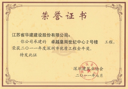 該工程先后被評為深圳市優(yōu)質(zhì)結(jié)構(gòu)工程、深圳市優(yōu)、“金牛獎”、 廣東省建筑業(yè)新技術(shù)應(yīng)用示范工程、全國AAA級安全文明標(biāo)準(zhǔn)化誠信工地、江蘇省省優(yōu)“揚子杯”和廣東省優(yōu)良樣板工程。