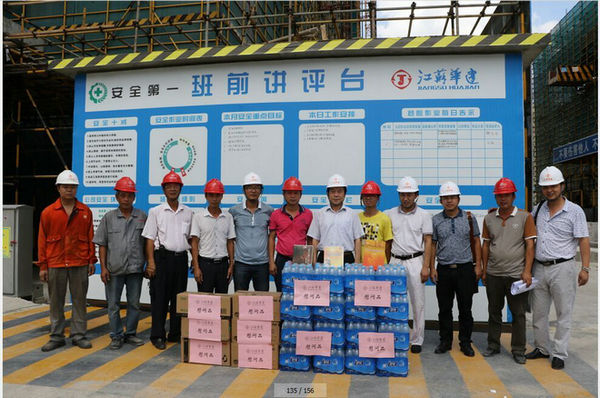 區域公司領導赴三亞工地進行高溫慰問 時間:2015-06-20 3218 6月19日上午,海南分公司黨總支副書記沈巨青帶隊,在分公司工會代表等相關部門陪同下,走訪慰問了三亞婦幼保健院項目部,看望了堅守崗位奮戰在高溫一線的項目部人員,并給他們送去了礦泉水、洗漱用品和防暑藥品。 慰問組一行實地了解項目部的進展情況以及現場人員的食、住、行、業務學習安排等情況,叮囑大家在高溫季節要切實加強現場管理,繃緊安全弦,確保平穩有序生產。