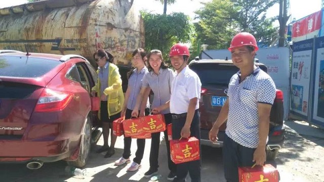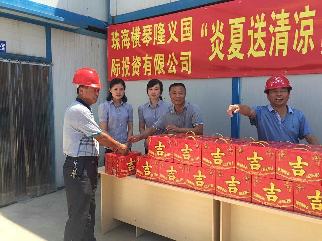 炎炎夏日送清涼 時間:2016-08-01 3850 7月30日上午,珠海分公司橫琴隆義廣場項目部工地熱浪朝天,機聲隆隆,人來人往,一派繁忙景象。一支由江蘇華建直五項目部和橫琴隆義投資公司共同組成的“送清涼”小分隊也在工地上奔忙著,項目經理姚寧與投資公司負責人王艷、許珂等正在將一箱箱王老吉飲料有條不紊地送到建筑工人手中,讓廣大一線職工在炎炎烈日下感受到陣陣清涼。